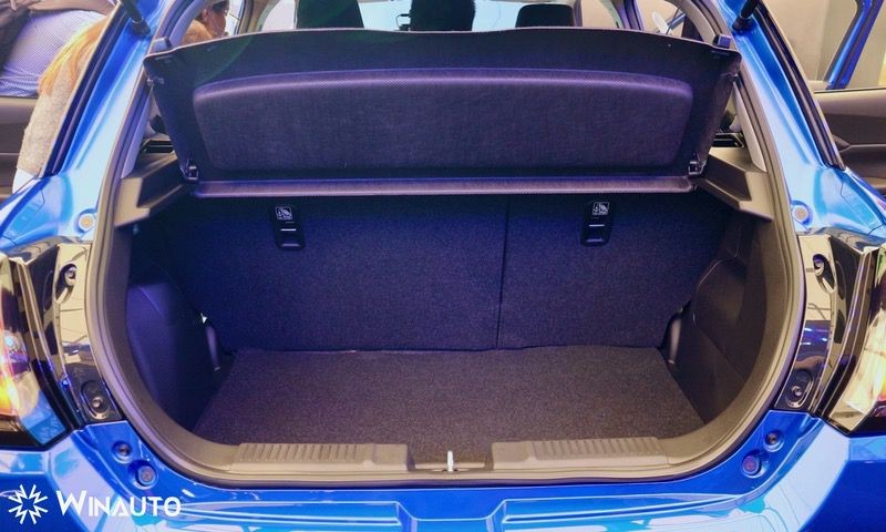Suzuki Swift 2025 có dung tích khoang hành lý tiêu chuẩn 918 lít và có thể mở rộng thêm khi gập hàng ghế sau.